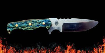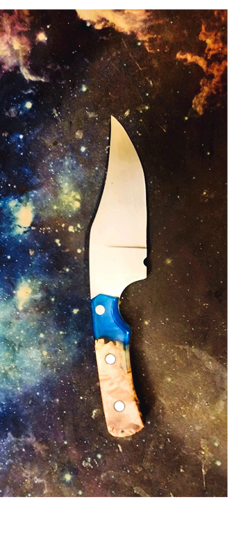 Rustic Hunter blade, with blue acrylic and burl handle.